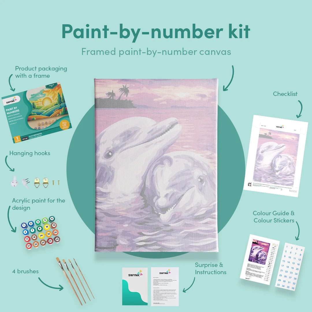 Create stunning paint by numbers designs featuring dolphins. Painting dolphins is super easy. Choose one of our paintings and receive a toolkit with paint, brushes, and a linen canvas.