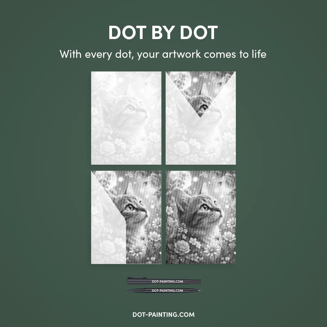 With Dot Painting, you use high-quality markers to bring the Cat with Flowers Dot Painting kit to life, one dot at a time. It’s cleaner, easier, and incredibly satisfying.