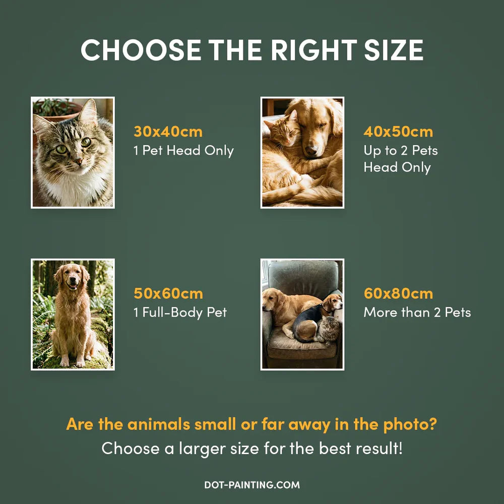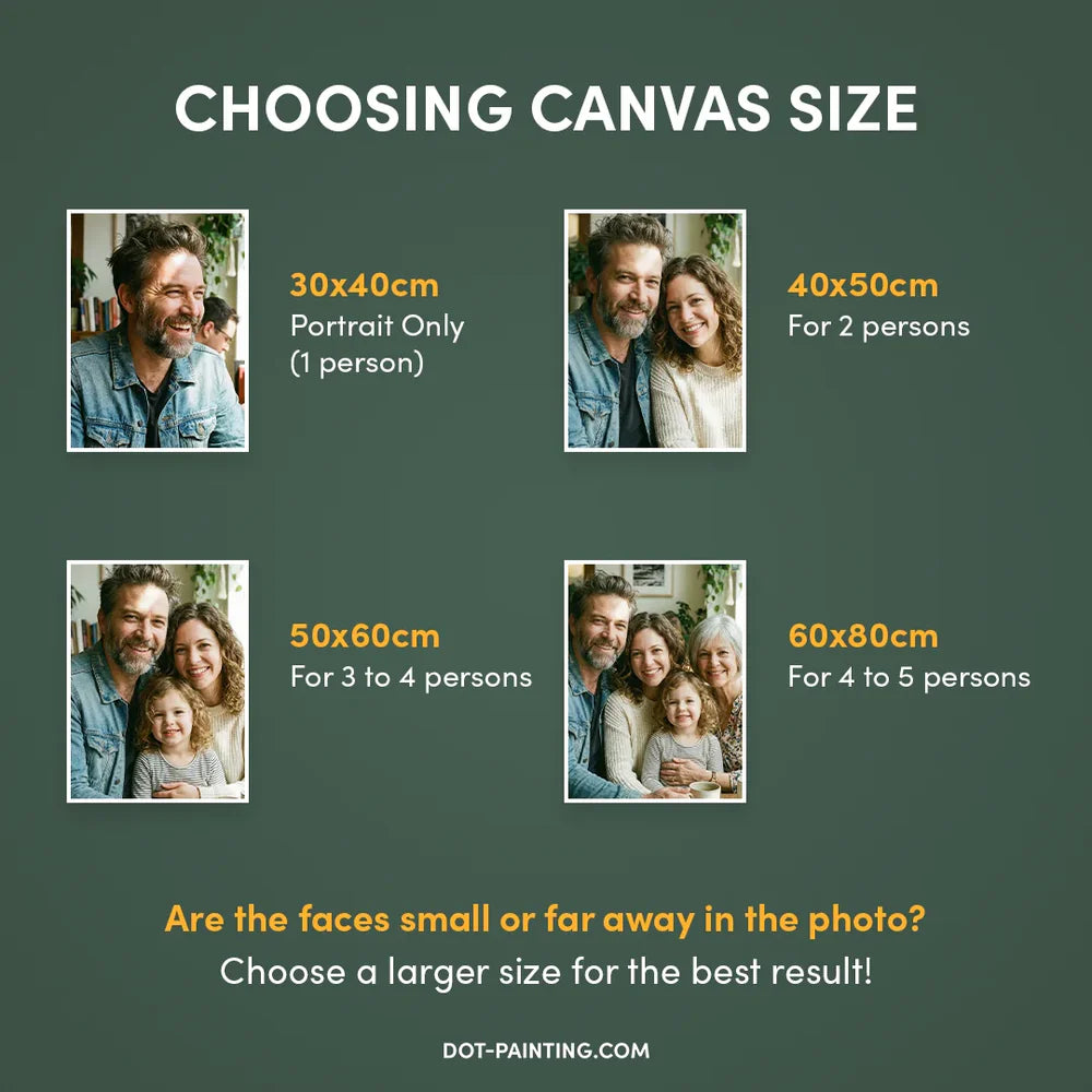 Size Matters While the smaller 8x12" size is cute for simple images, we highly recommend choosing a size of at least 12x16" or 16x20" for the best result. The rule of thumb in Dot Painting is simple: the larger the canvas, the more detail we can capture, and the more stunning your final masterpiece will be.