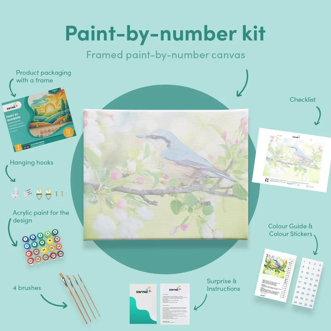 Hou je van vogels en bloemen? Je bent niet de enige! Onder de schilderen op nummer kits voor volwassenen en senioren is dit een van de meest bestelde producten. De kleuren harmoniëren prachtig met elkaar en het schilderij straalt rust uit, zowel tijdens het maken als wanneer het af is. Het is een perfect stuk om in te lijsten en aan de muur te hangen, waar je zelf kunt beslissen in welk formaat je ermee wilt werken.
