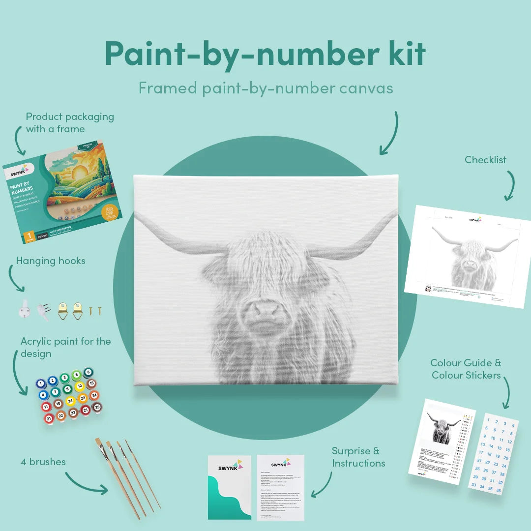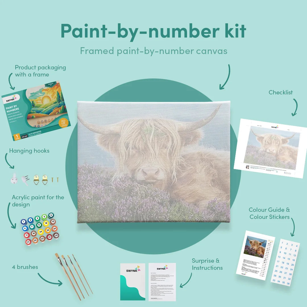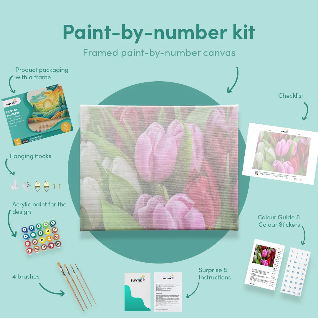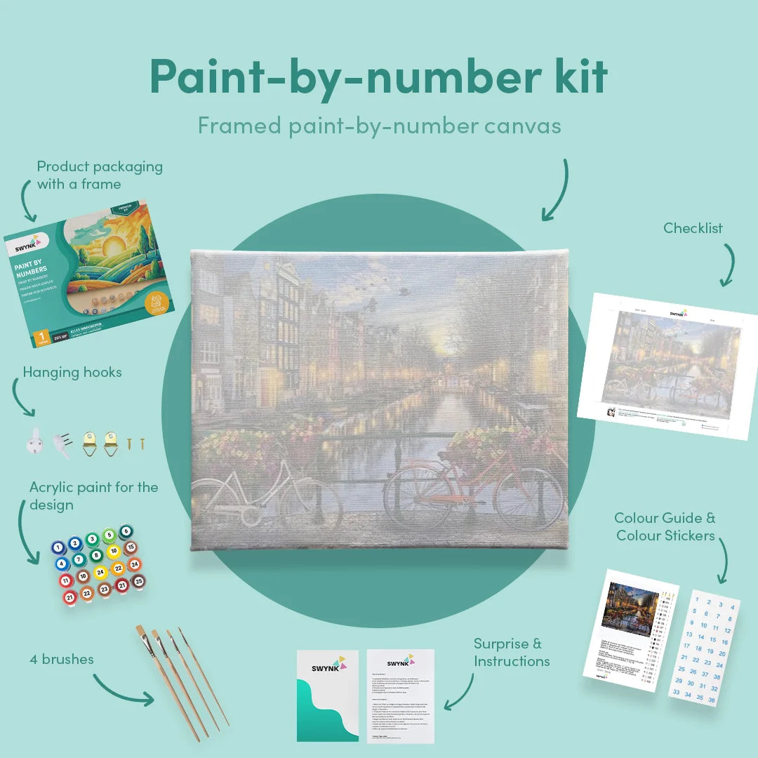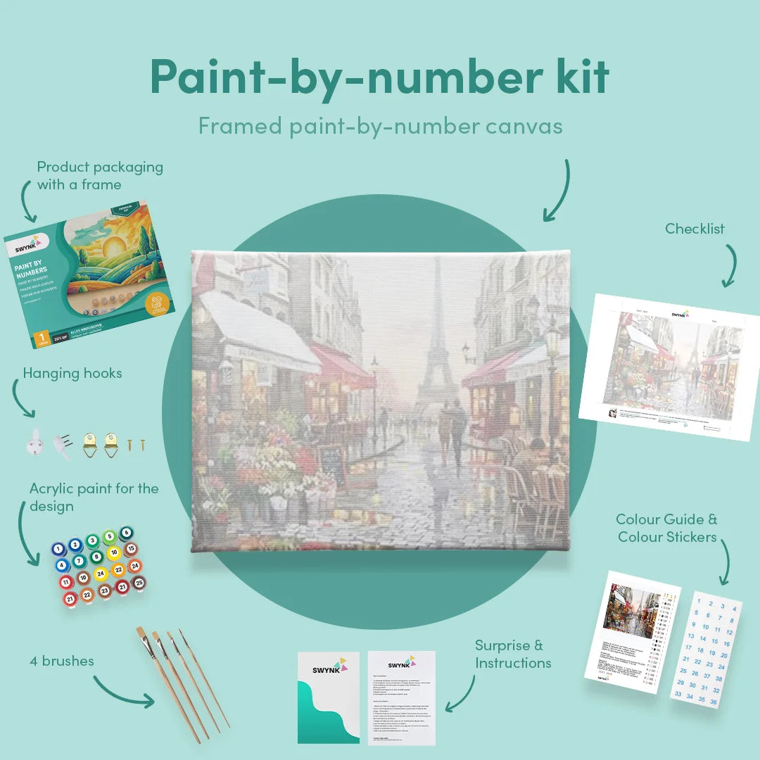 Je kit bevat alles wat je nodig hebt: een canvas, 36 verfkleurden en 5 premium penselen. Als je een model met een lijst bestelt, leveren we ook de lijst erbij om je meesterwerk mooi in te lijsten. Schilderen op nummer voor volwassenen is eenvoudig—je hoeft alleen de genummerde vakjes op het canvas te matchen met de bijbehorende verfkleuren. Voor je het weet, heb je een prachtig kunstwerk gecreëerd.