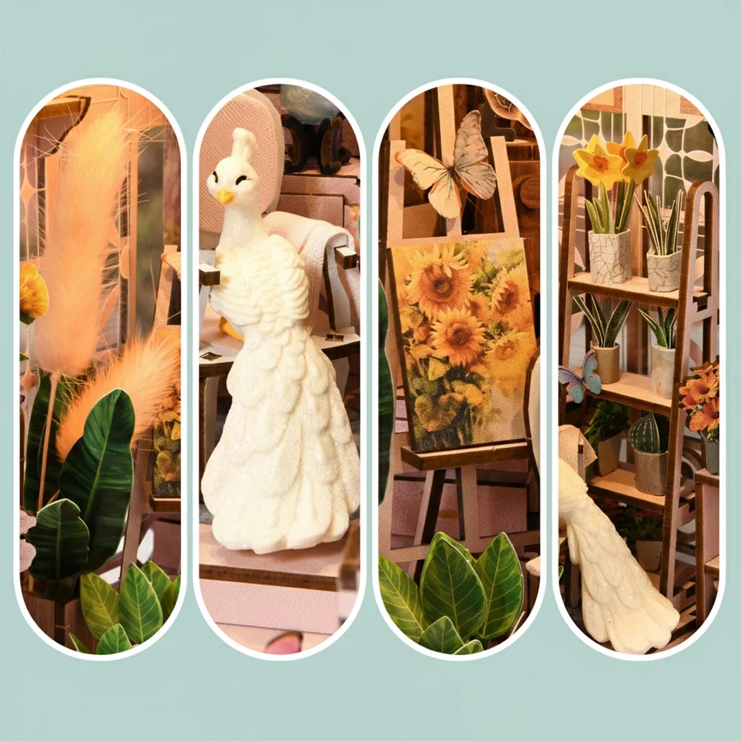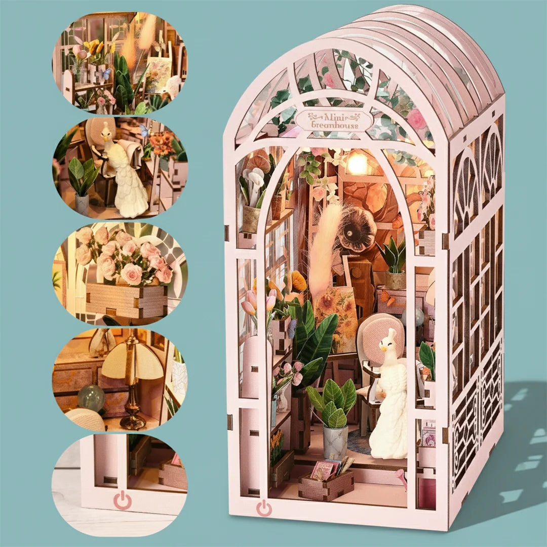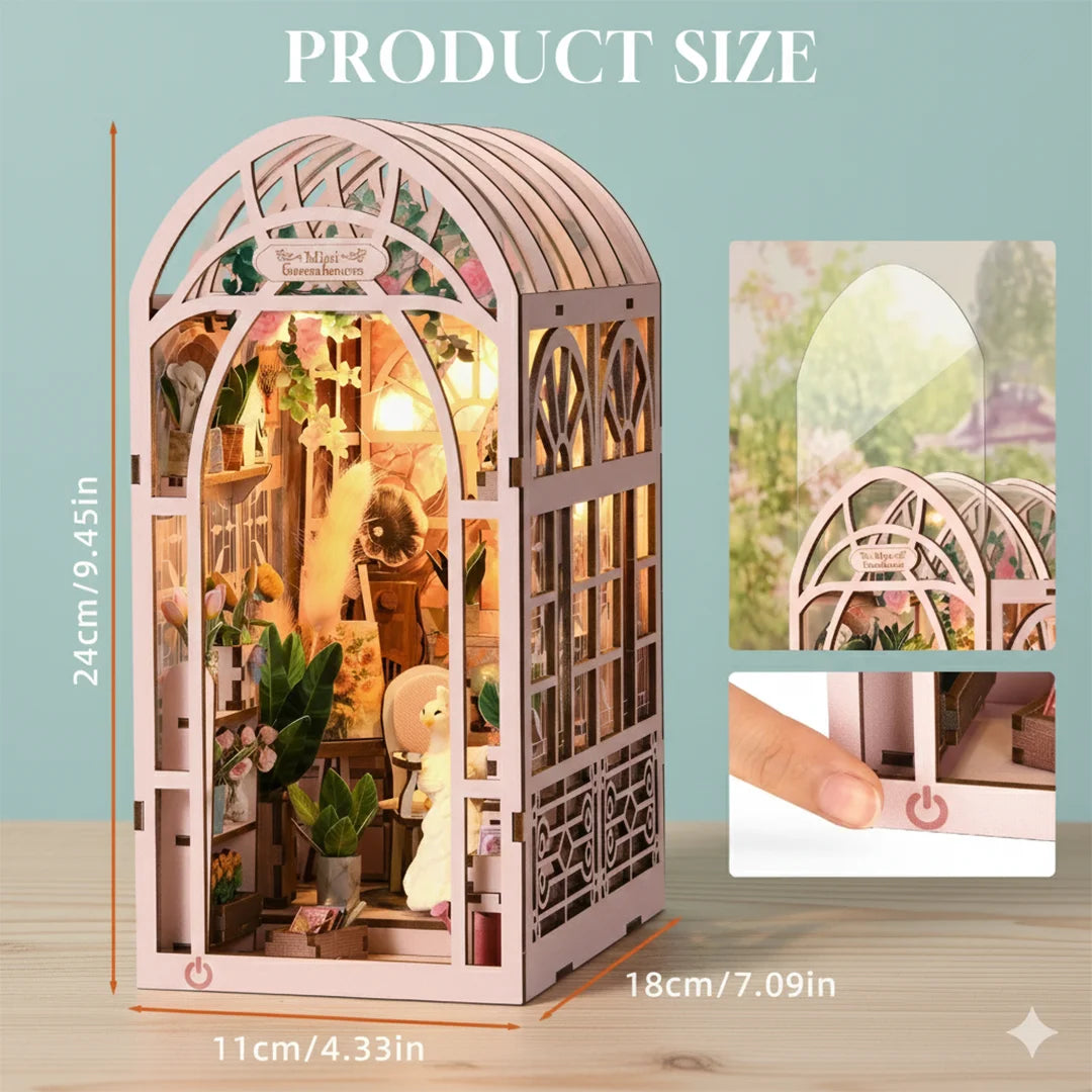 A Tranquil Sanctuary for Your Shelf Transform your bookshelf into a tranquil garden escape with the Mini Greenhouse DIY Book Nook Kit. This isn't just a model; it's a breath of fresh air. Featuring a soft pink color palette and intricate architectural details, this enchanting miniature captures the beauty of a serene plant haven. It’s the perfect blend of romance and artistry, inviting you to step inside a world of eternal spring. Take a look at our other book nooks in our store!
