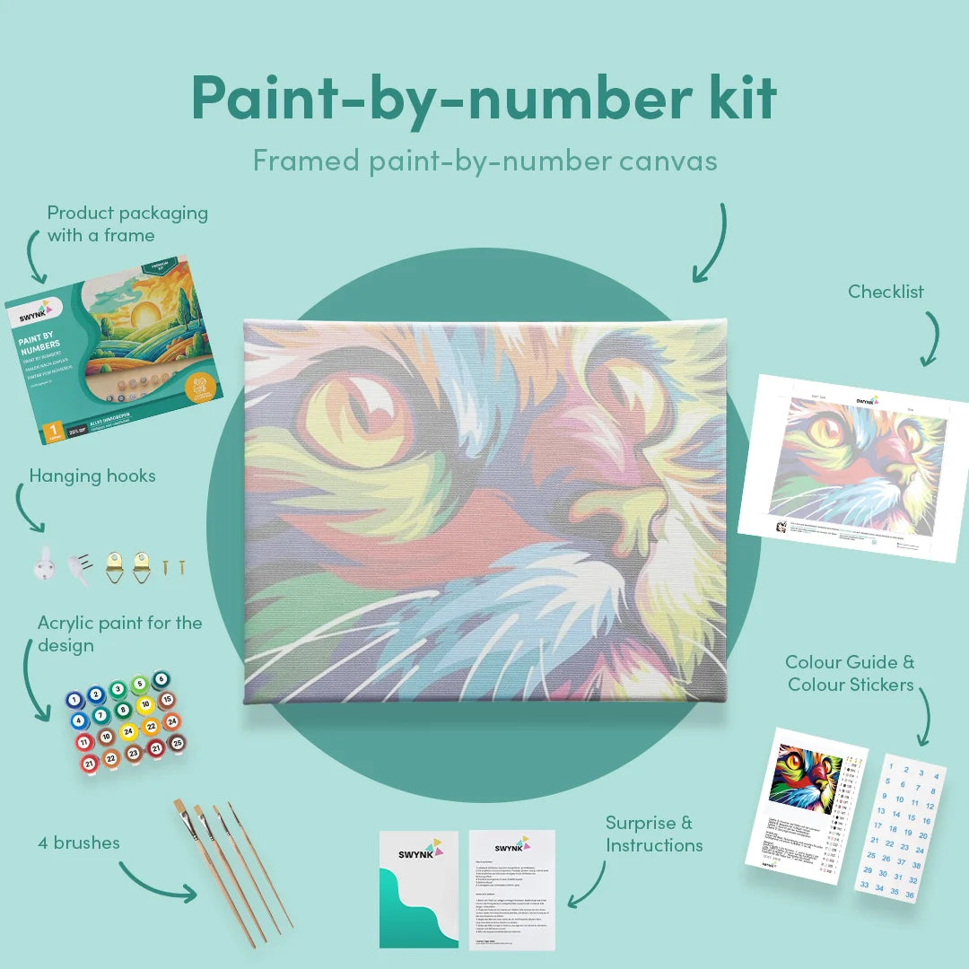 Explore the paint by numbers cats collection from Swynk. Looking for a paint by numbers cat head, a paint by numbers cat and butterfly or perhaps a paint by numbers dogs and a paint by numbers monkeys is perfect for you! Paint by numbers is also known as painting by numbers or simply paint by numbers. Can't find your preferred cat image? Take advantage of our custom photo option! Search for your favorite photo on Google and upload it through our website.