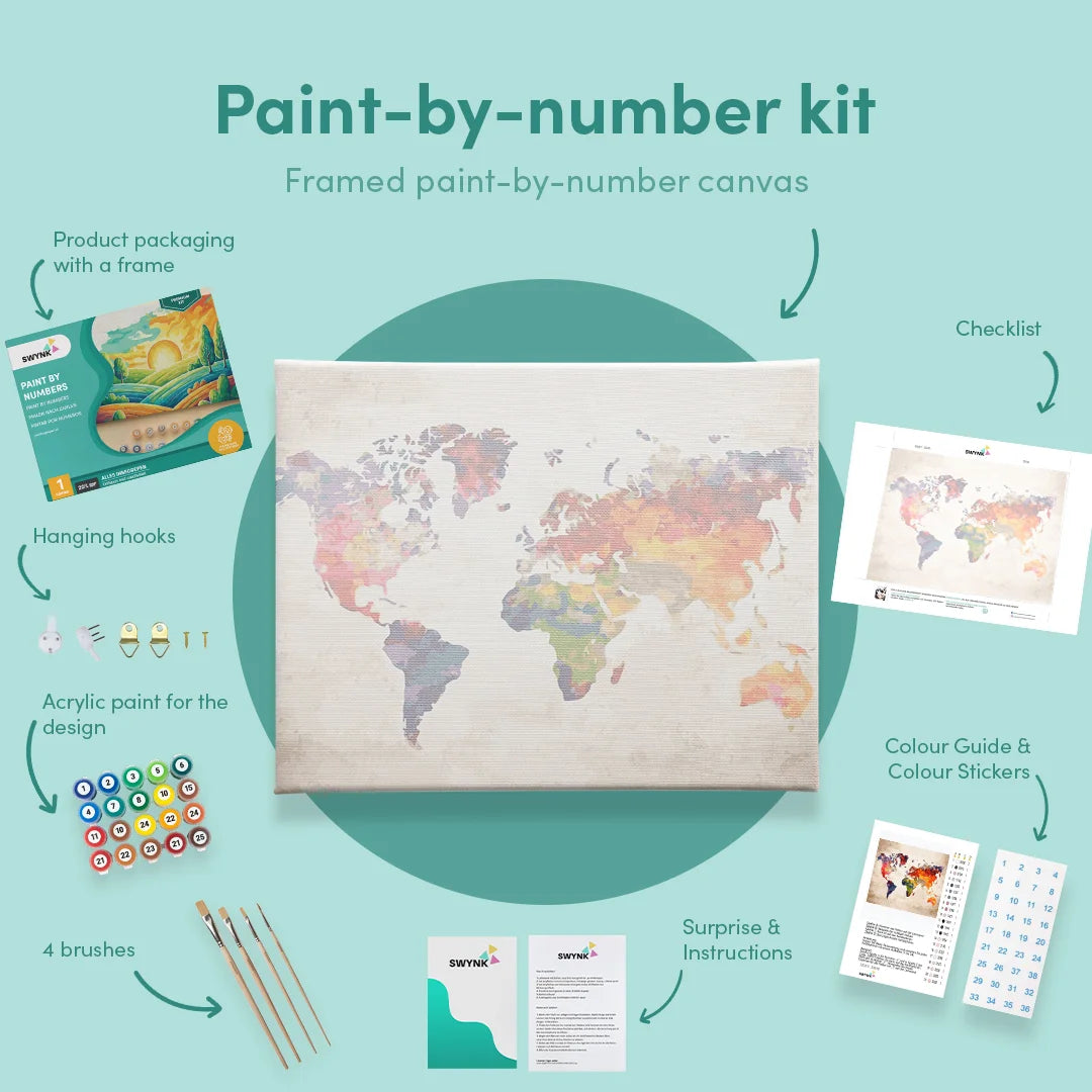 With the paint by numbers world map collection, Swynk has brought to life a special series that expresses the desire for artistic travel through world maps. With paint by numbers world maps, you can not only recreate the world map but also discover it in a new, artistic way.