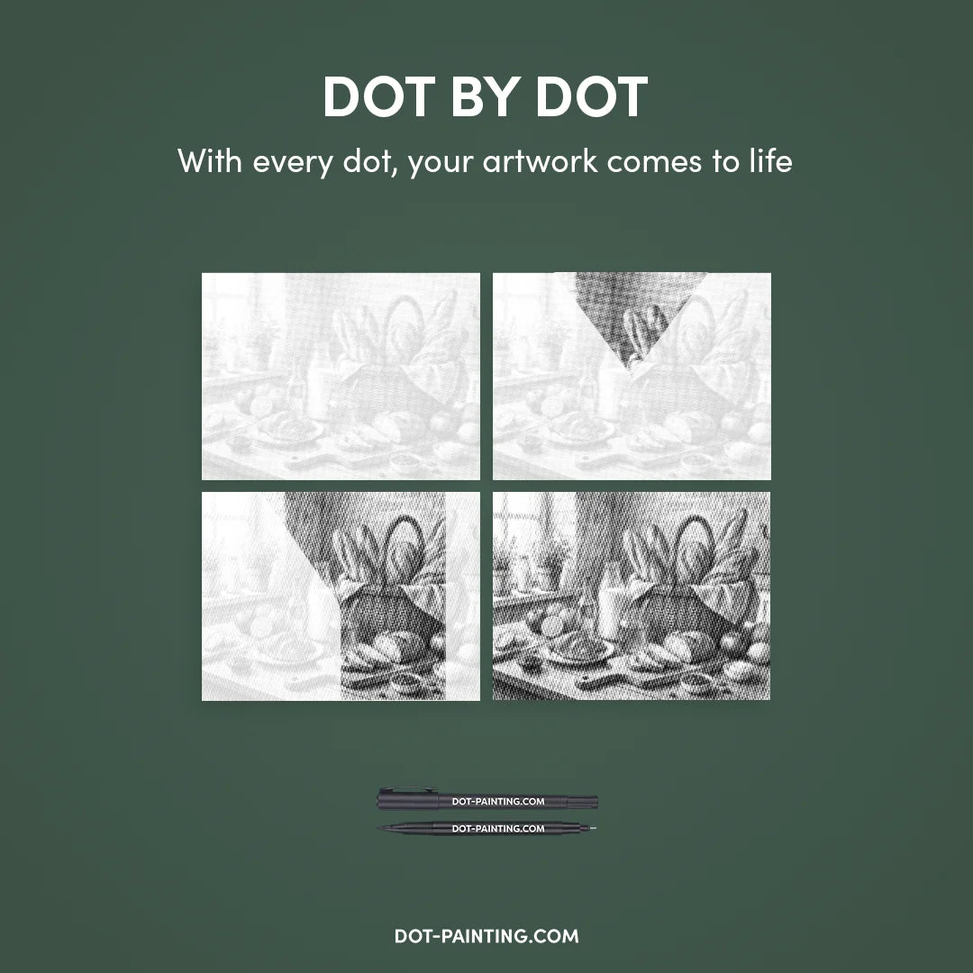 With Dot Painting, you use high-quality markers to bring the Bread Basket Dot Painting kit to life, one dot at a time. It’s cleaner, easier, and incredibly satisfying.
