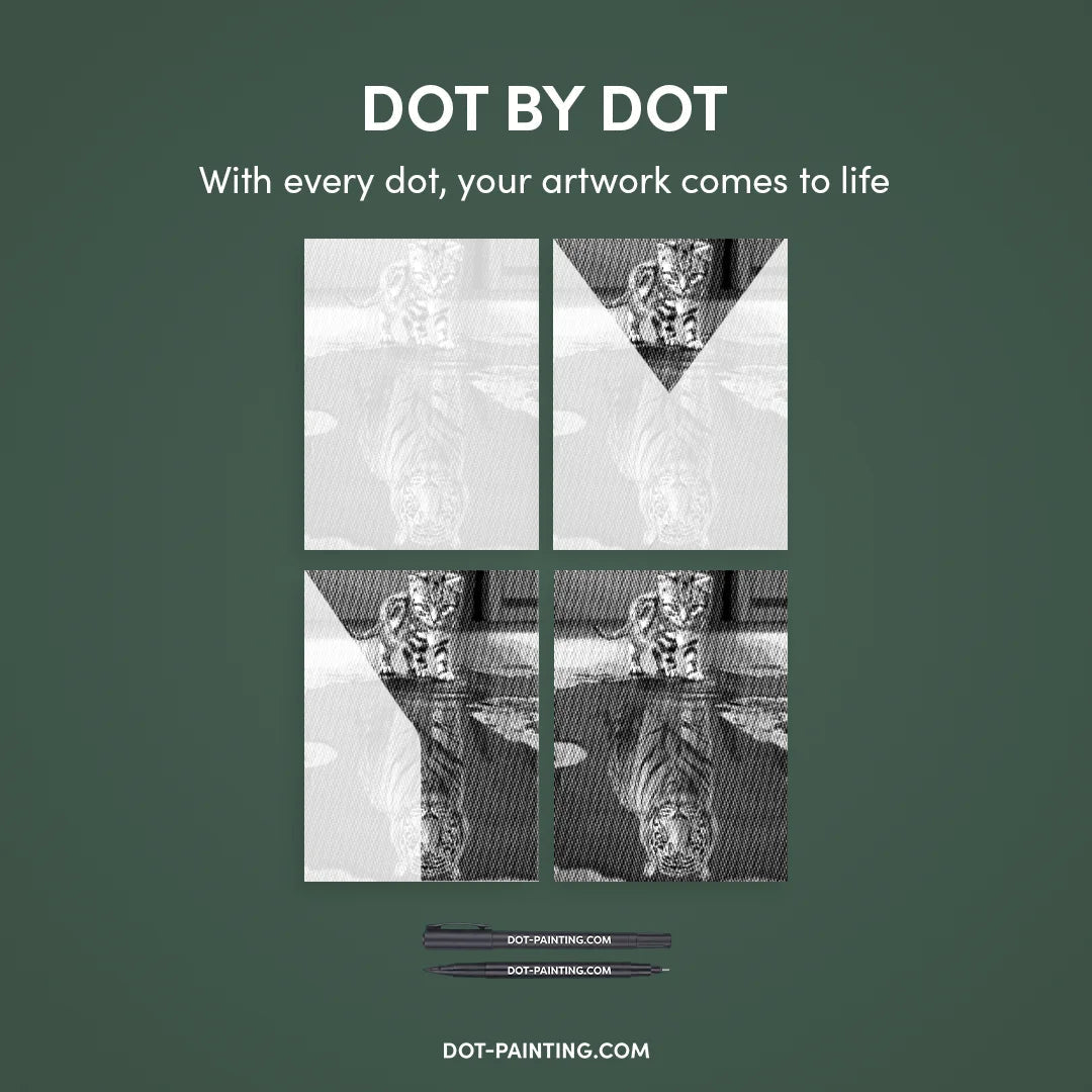 With Dot Painting, you use high-quality markers to bring the Cat With Tiger Reflection Dot Painting kit to life, one dot at a time. It’s cleaner, easier, and incredibly satisfying.