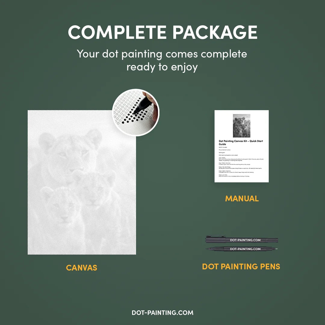 With Dot Painting, you use high-quality markers to bring the Lion Family Dot Painting kit to life, one dot at a time. It’s cleaner, easier, and incredibly satisfying.