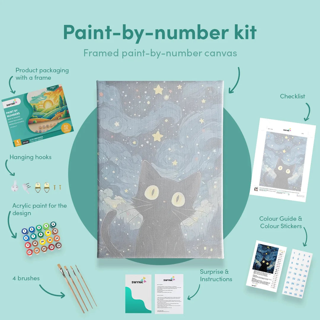 ✔ All supplies: Premium canvas, brushes, acrylic paint and a sample on A3 paper